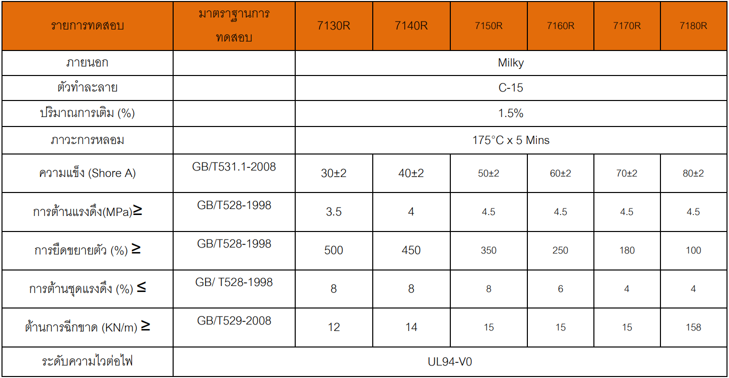 PS-7150R series เป็นยางซิลิโคนที่สามารถทนการลามไฟได้เป็นอย่างดี เหมาะสำหรับกระบวนการอัดขึ้นรูปด้วยวิธี extrusion molding and calendaring molding processes(การรีด)